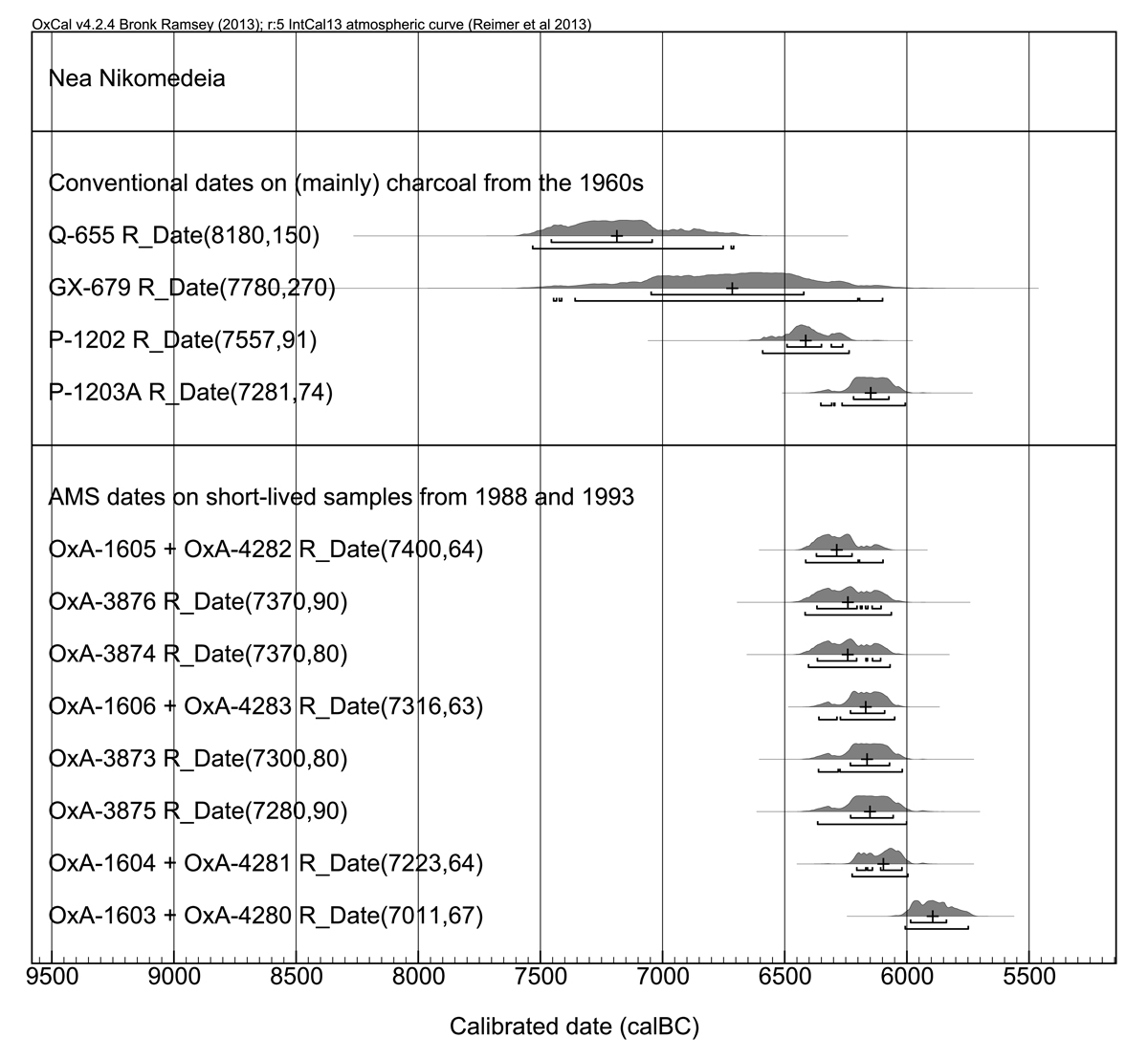 Initially, the excavators conceived of Nea Nikomedeia as a two-layered site (Pyke 1996, 9 and Fig. 2.1), the c. 60–70 cm deep deposits being excavated in up to three spits of each c. 20 cm (Pyke 1996, 35, Table 2.1). Four samples from the EN (Q-655, GX-679, P-1202 and P-1203A) were analysed already in the early and mid-1960s (Figure 3), the two earliest of which support the (meanwhile refuted) opinion (Reingruber and Thissen 2009) that also in Macedonia the Neolithic started around or before 7000 BC. In the original report (based on the information given by the excavator R. J. Rodden) R. Stuckenrath assigns the two oldest dates as deriving "certainly from first building period"; the older Pennsylvania date is assigned to the "very probably first building period", and date P-1203A to the "probably first building period" although with some reservations. (Stuckenrath 1967, 335). According to C. Perlès (2001, 100–101, table 6.1) the three oldest mentioned dates should be contemporaneous and belonging to the first (lowest) building period EN1, but she rejects Q-655 and GX-679. The fourth date (P-1203A) was assigned by her to Phase EN2 (Perlès 2001, 104, table 6.1).