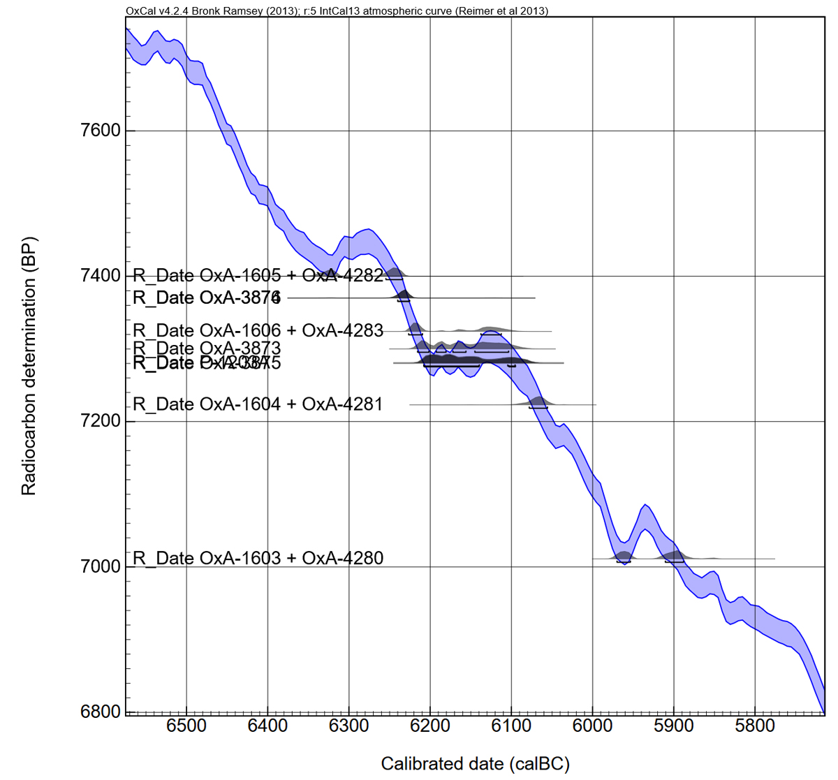 At first sight, the AMS-radiocarbon dates corroborate the separation into three datable clusters: the oldest dates (the combined dates OxA-1605 + OxA-4282, date OxA-3876 and OxA-3874) are falling between 6350 and 6250 BC; a group of five dates is covering the 62