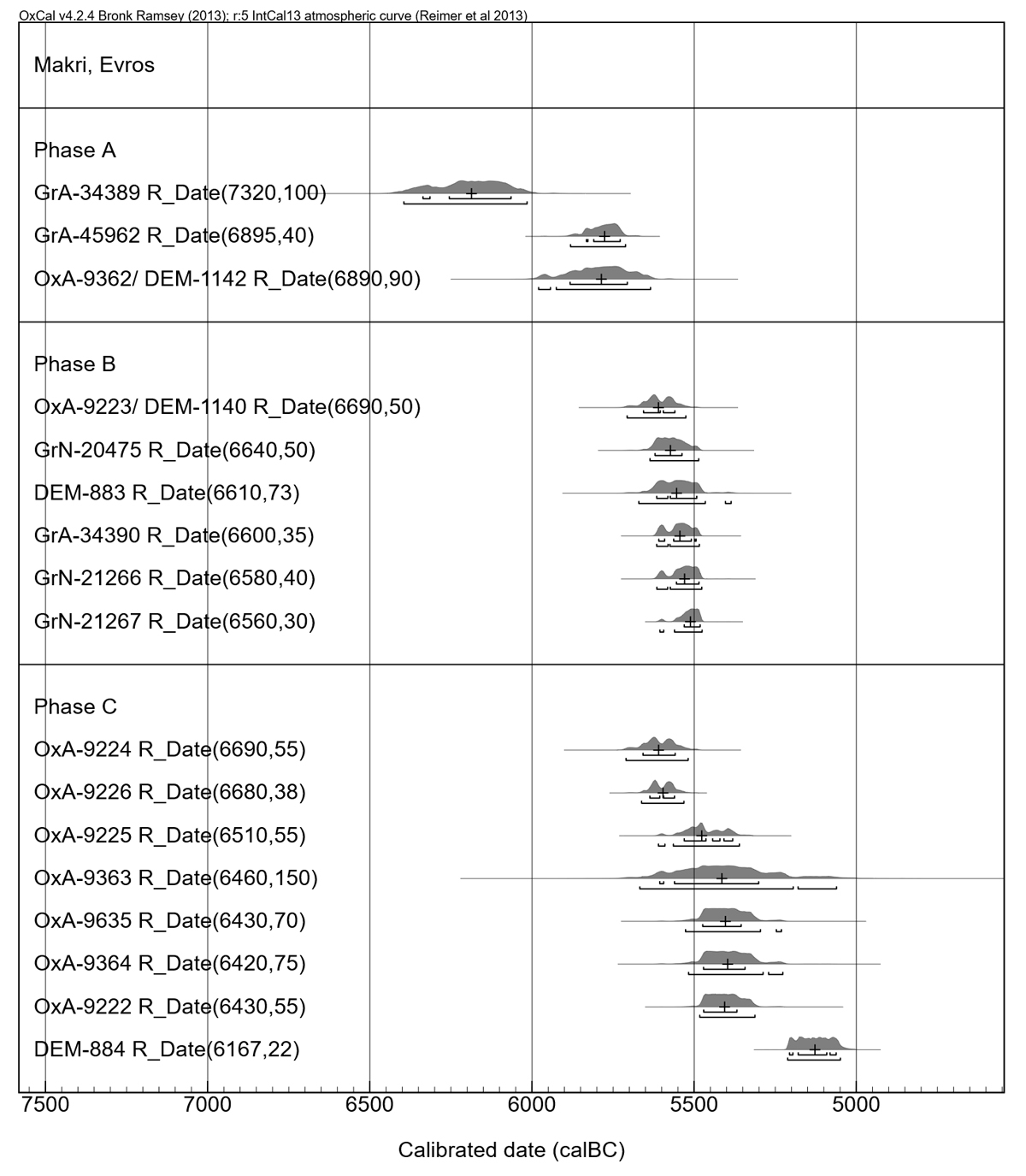 Figure 7. Calibrated dates from Makri, Evros, West Thrace, arranged according to phases and ages.