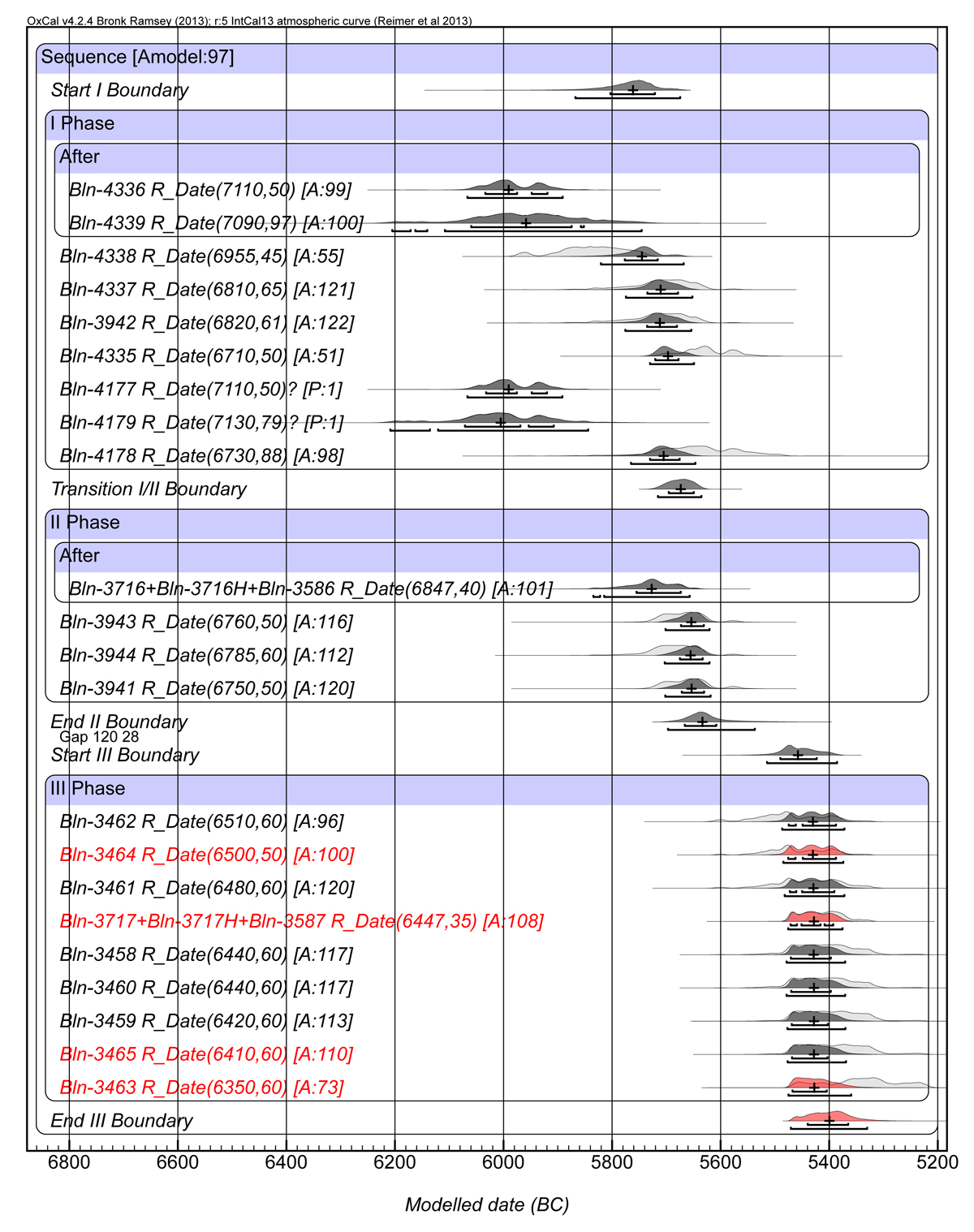 The second half of the Azmak sequence (levels I-4 to I-6) is less tightly dated than levels I-1 to I-3. The dates from levels I-4 and I-5 involve two charcoal samples in I-4 (Bln-300 and Bln-301), and a seed sample (Bln-430) with a rather low agreement (A:69) in I-5. In view of this unbalanced representation of dates (note that also architectural remains from levels I-4 to I-6 are fragmentarily preserved only), a curtailed sequence model may be useful and perhaps more tightly fixing the beginning of the site in time (Figure 4). This model doesn't deviate too much from the above one, the major difference being that the onset of the site would have taken place within a timespan set back a generation earlier (Table 2).