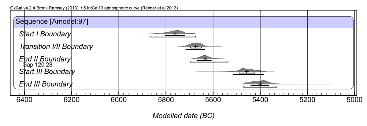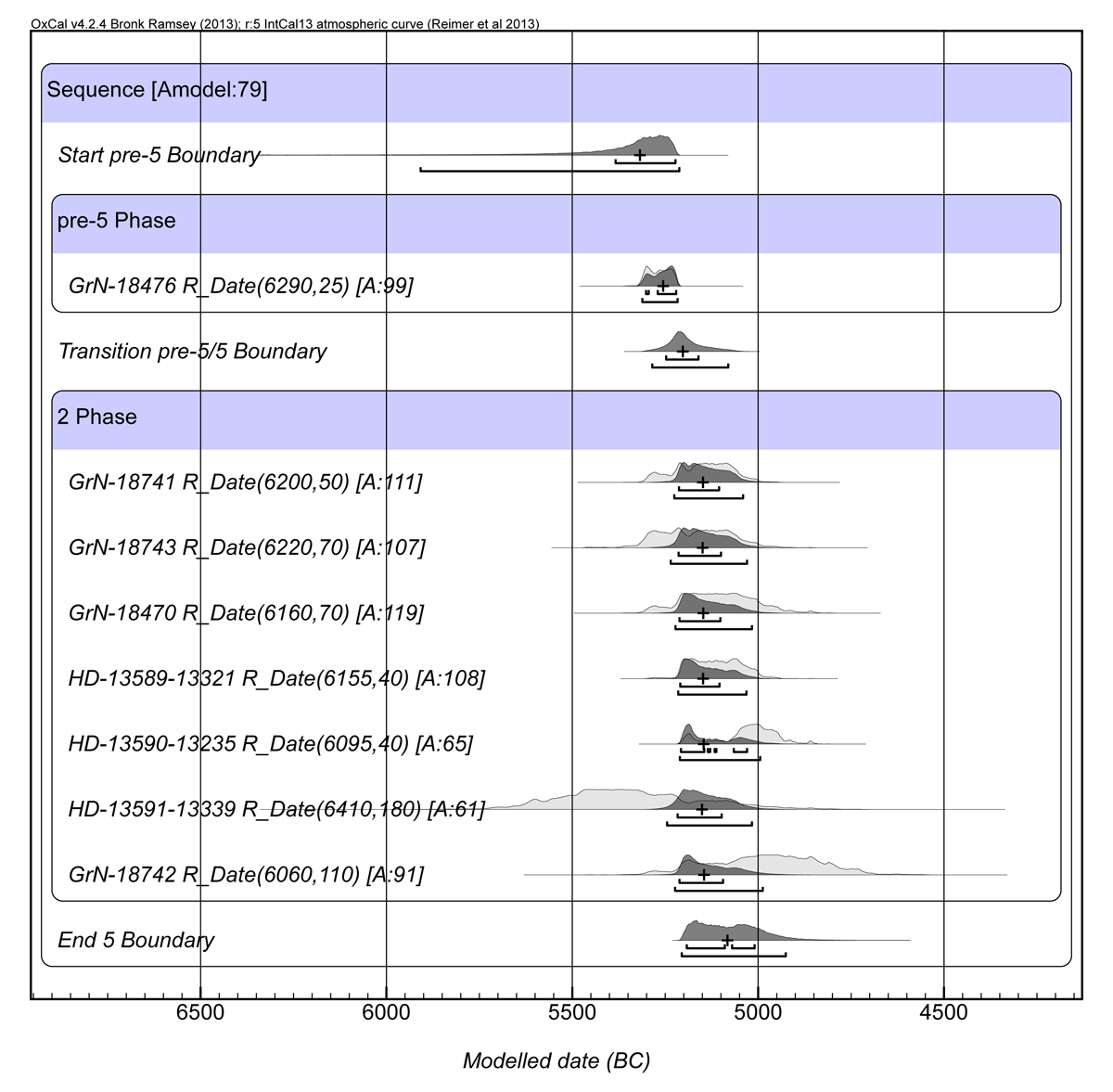 th C cal BC (see above, Azmak and Karanovo assessments). With these constraints in place, the boundary model has satisfactory overall agreement (Amodel: 75; Figure 5).