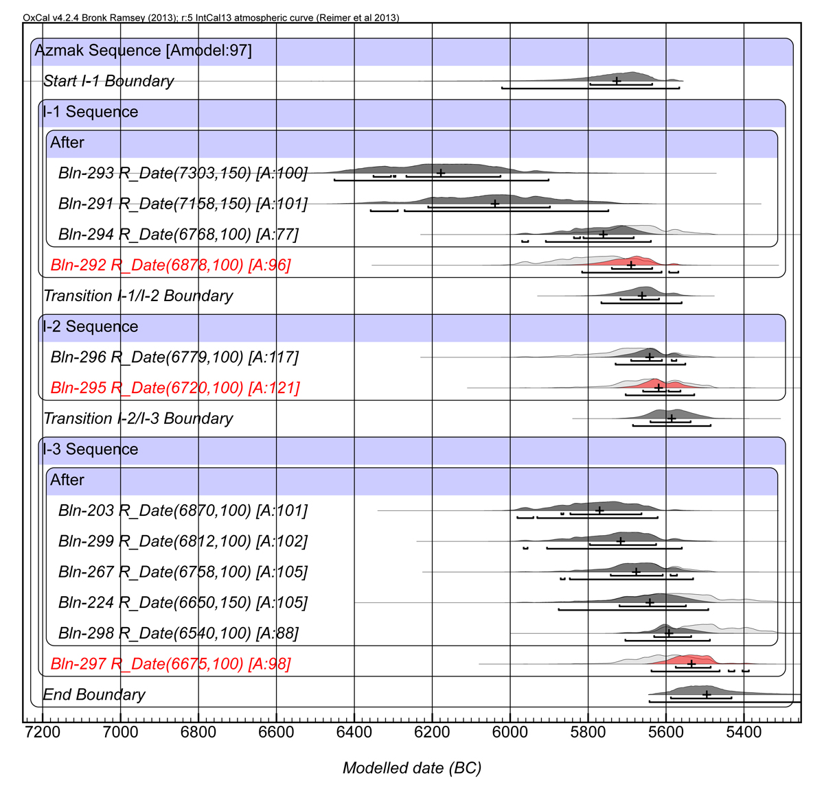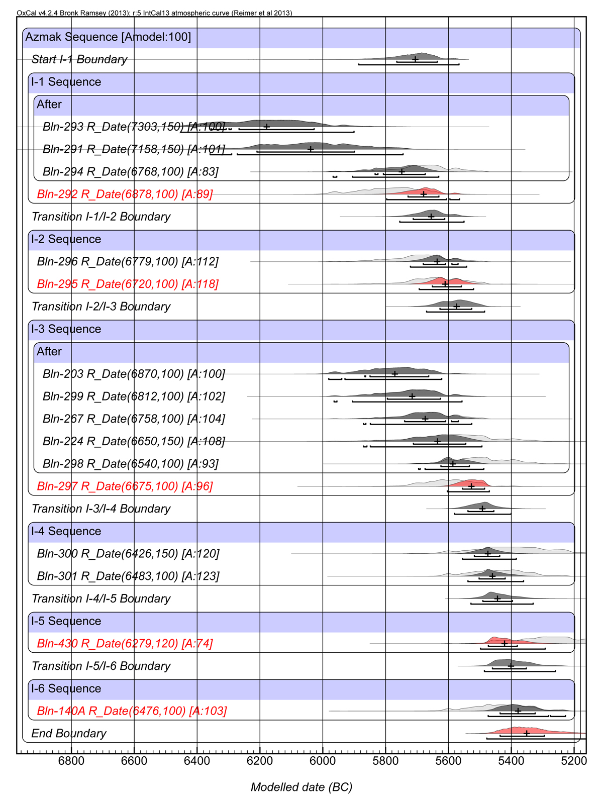 The Azmak dates fit well into a sequence model, apart from two very early dates which may suffer from the 'old-wood' effect (Bln-293 and Bln-291). These two are included in the model below as