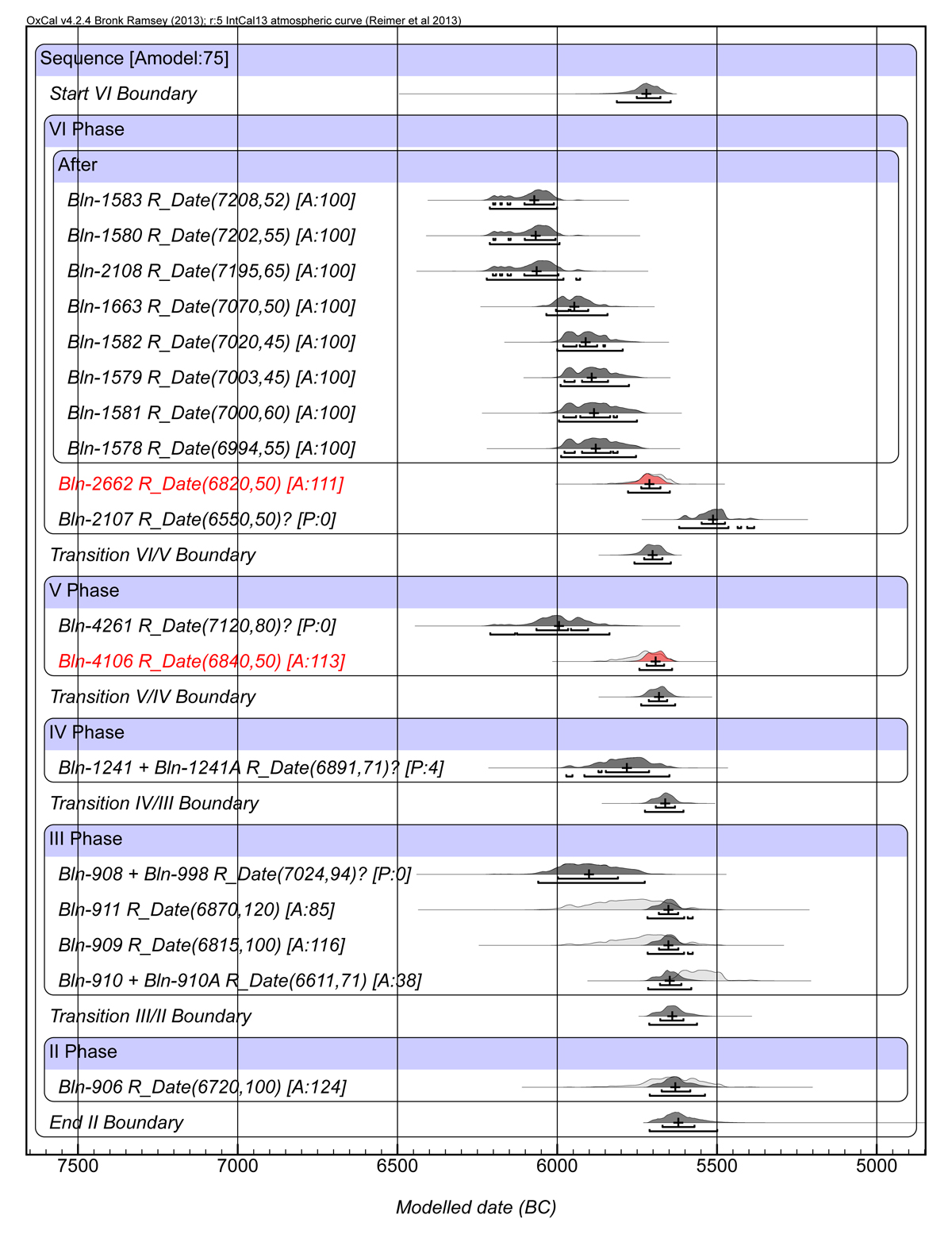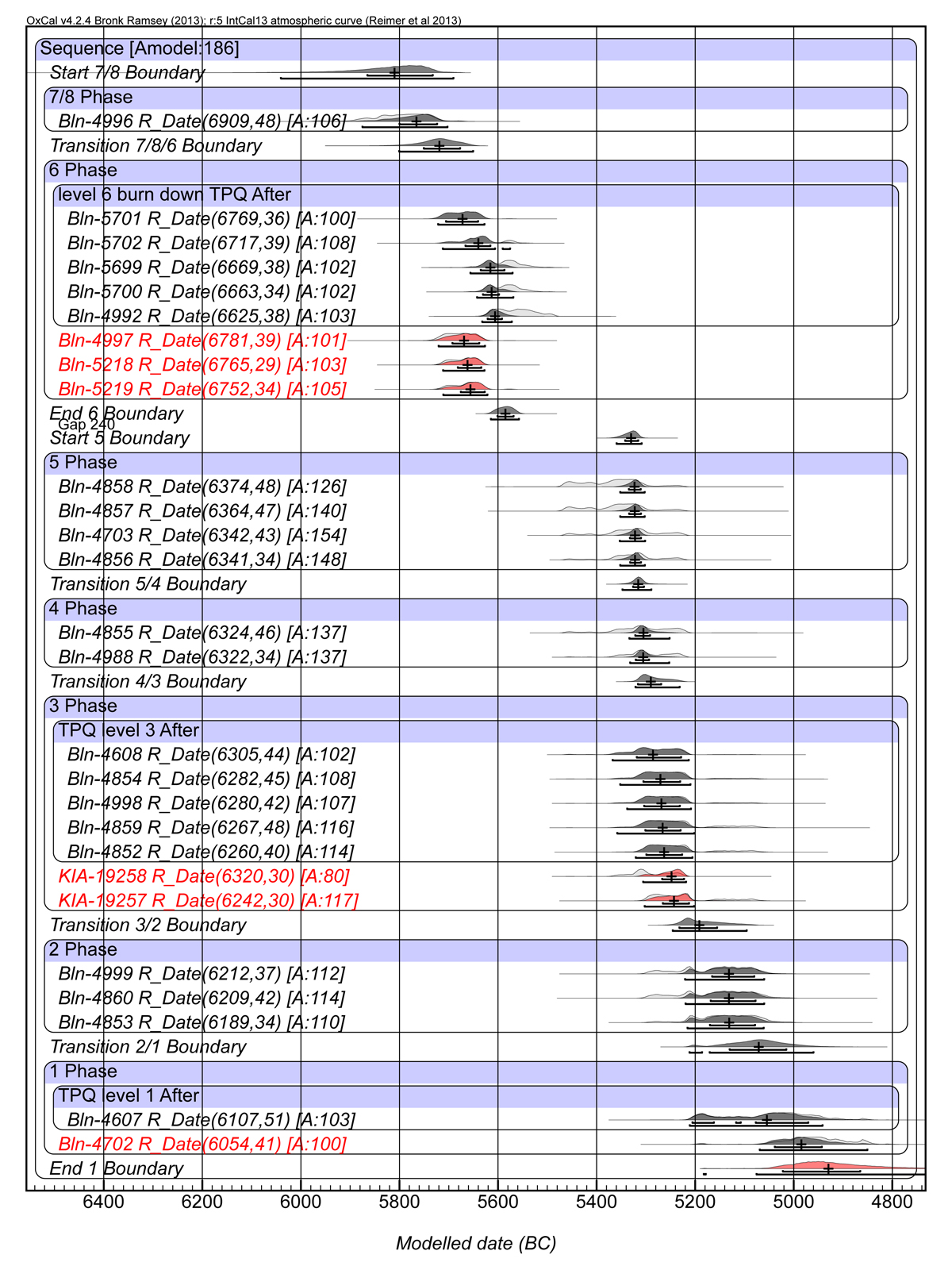 Figure 7. Aşağı Pınar sequence model based on the alternative phasing (Table 4), with short-lived samples in red, and an assumed gap of 240 yr between levels 6 and 5.