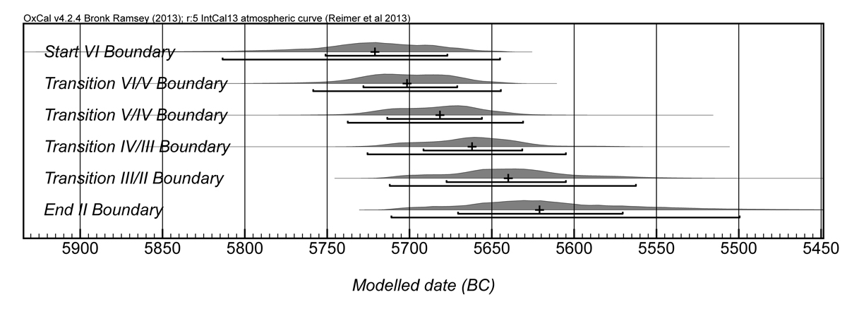 The boundary model as proposed demonstrates that the overall duration of Čavdar is quite short, and limited to a median span of a hundred years, between 5720–5620 cal BC. The calculated durations per level would have a median date of 20 years (Table 3, Figure 6). Applying an 'archaeological wiggle matching' (AWM) approach on the Čavdar data, Weninger tends to favour a 25-year duration per level as the most realistic one (Weninger 1992: 414).