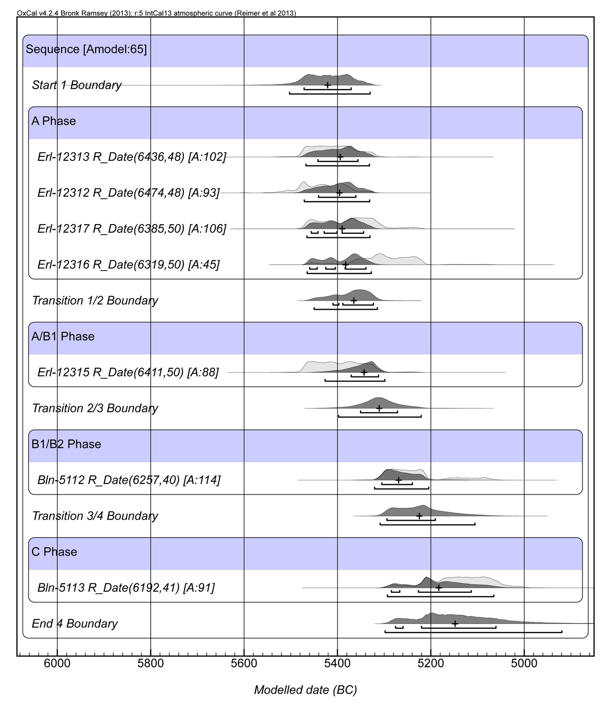 There is a discrepancy in the date sequence of the site: the four later dates from level 4 (Bln-4999, 4860, 4853 and 4607) and the one date from level 3/4 (Bln-4702), ranging between 5230–4940 and 5010–4850 cal BC (1σ), resp., are younger than the two data from stratigraphically later level 3 (KIA-19258 and KIA-19257) having a total range between 5330–5210 cal BC. Now, Aşağı Pınar 2 has a culturally similar assemblage to nearby site Toptepe level 5 (which has a radiocarbon range between 5300–4950 cal BC over 6 data). While at Aşağı Pınar no dates are available for level 2 strictly speaking, the Toptepe range is filled by the late dates cluster from level 4 and 3/4 as per above. Proposal therefore is to re-tag those dates to AP 2 and 1 instead (Table 4). A series of dates from levels 5, 4/5, and the earlier ones from level 4 have also been slightly re-labelled, but these divisions are in fact arbitrary, since the dates are close-packed, indicating a continuous sequence punctuated by radiocarbon events close to one another.