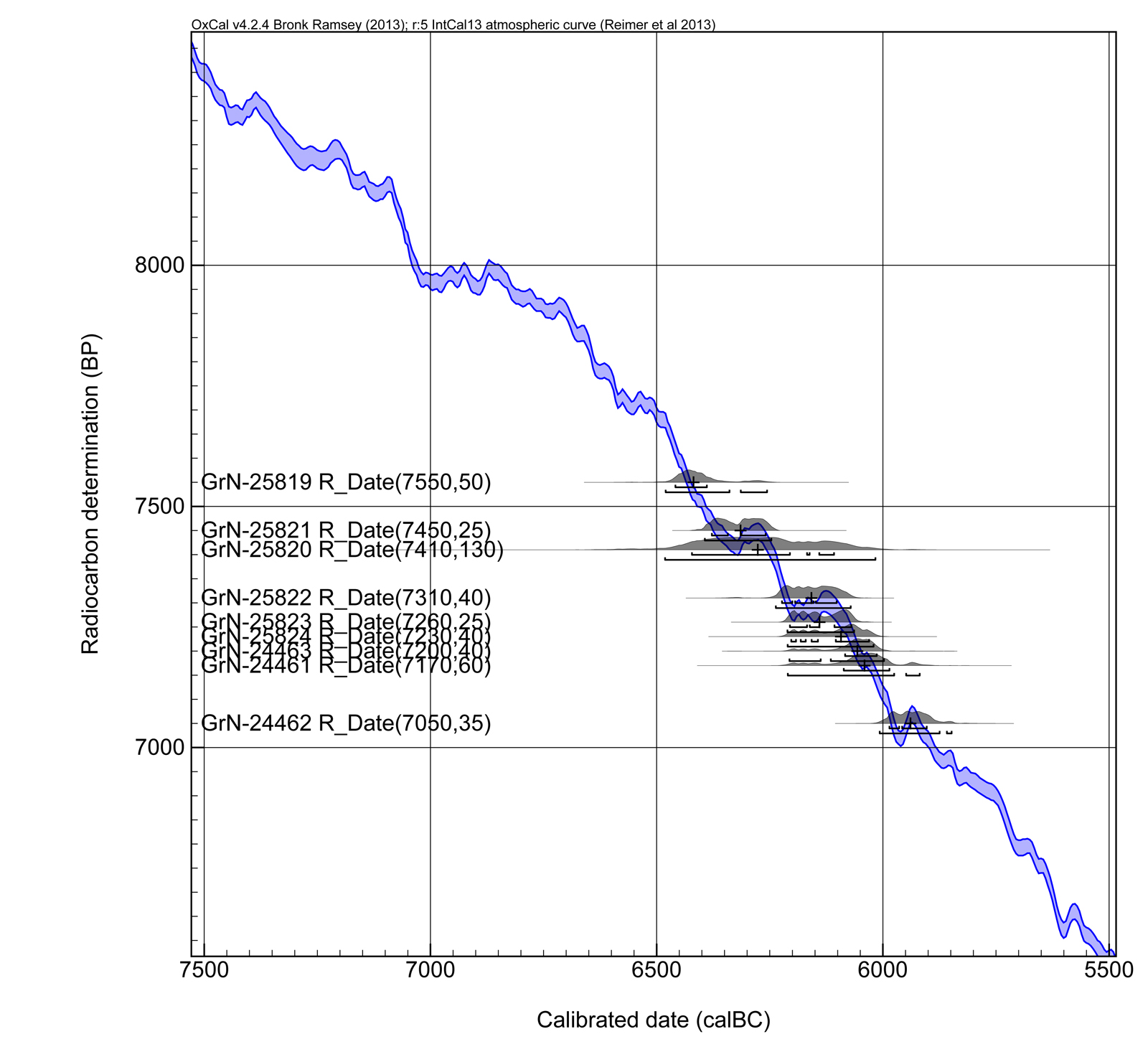 Combine command in OxCal yields a 1σ range between 5950–5910 cal BC indicating this event. From Phase VB six charred seed samples yield a combined result indicating a range between 5550–5520 cal BC for the fire destruction of Ilıpınar VB.