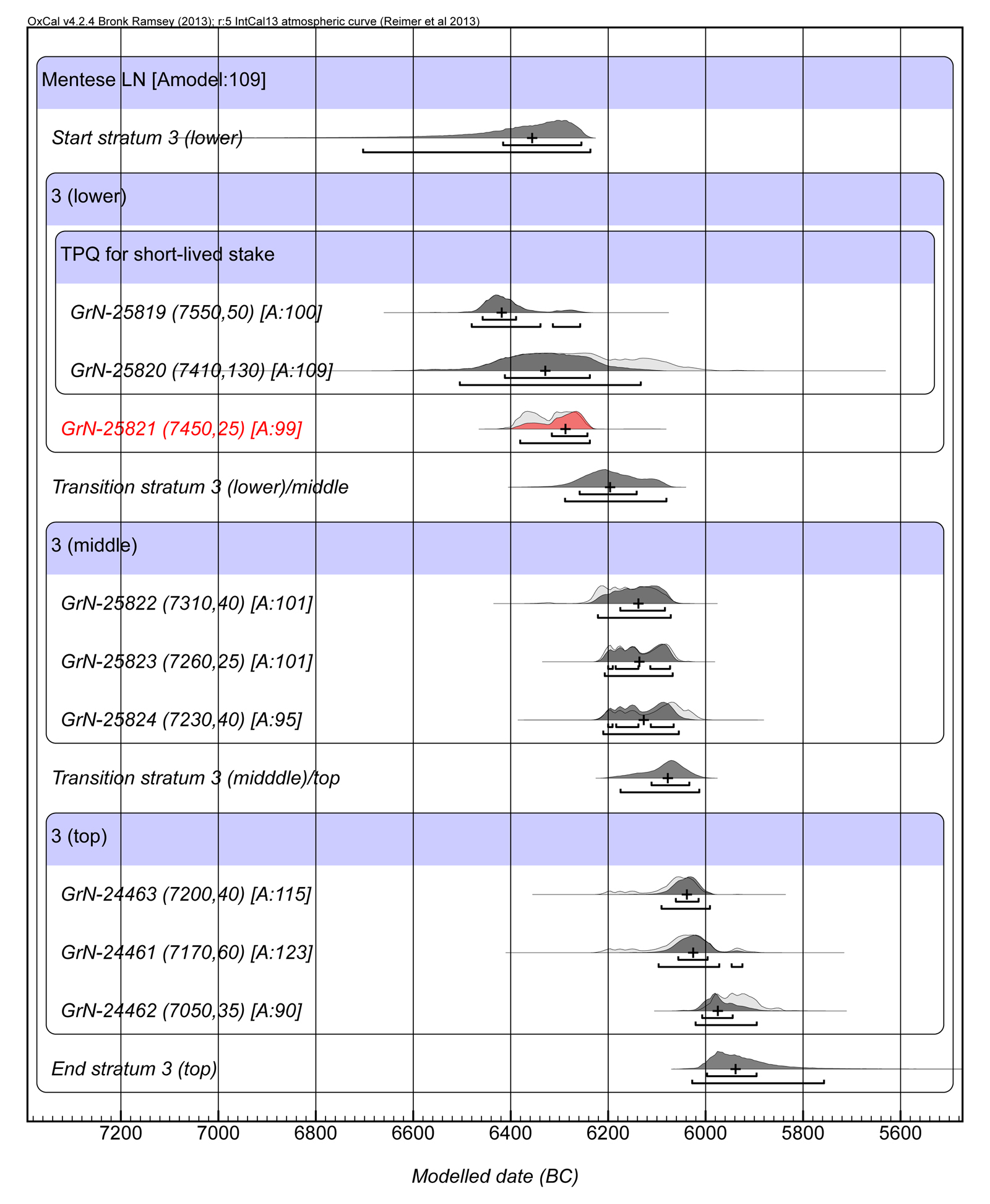 Figure 2. Menteşe boundary model using a TPQ hypothesis grouping GrN-25819 and GrN-25820 treating GrN-25821 (in red) as a short-lived sample. The result (Amodel: 109) harmonises the dating with the archaeological (ceramics) evidence (see text).