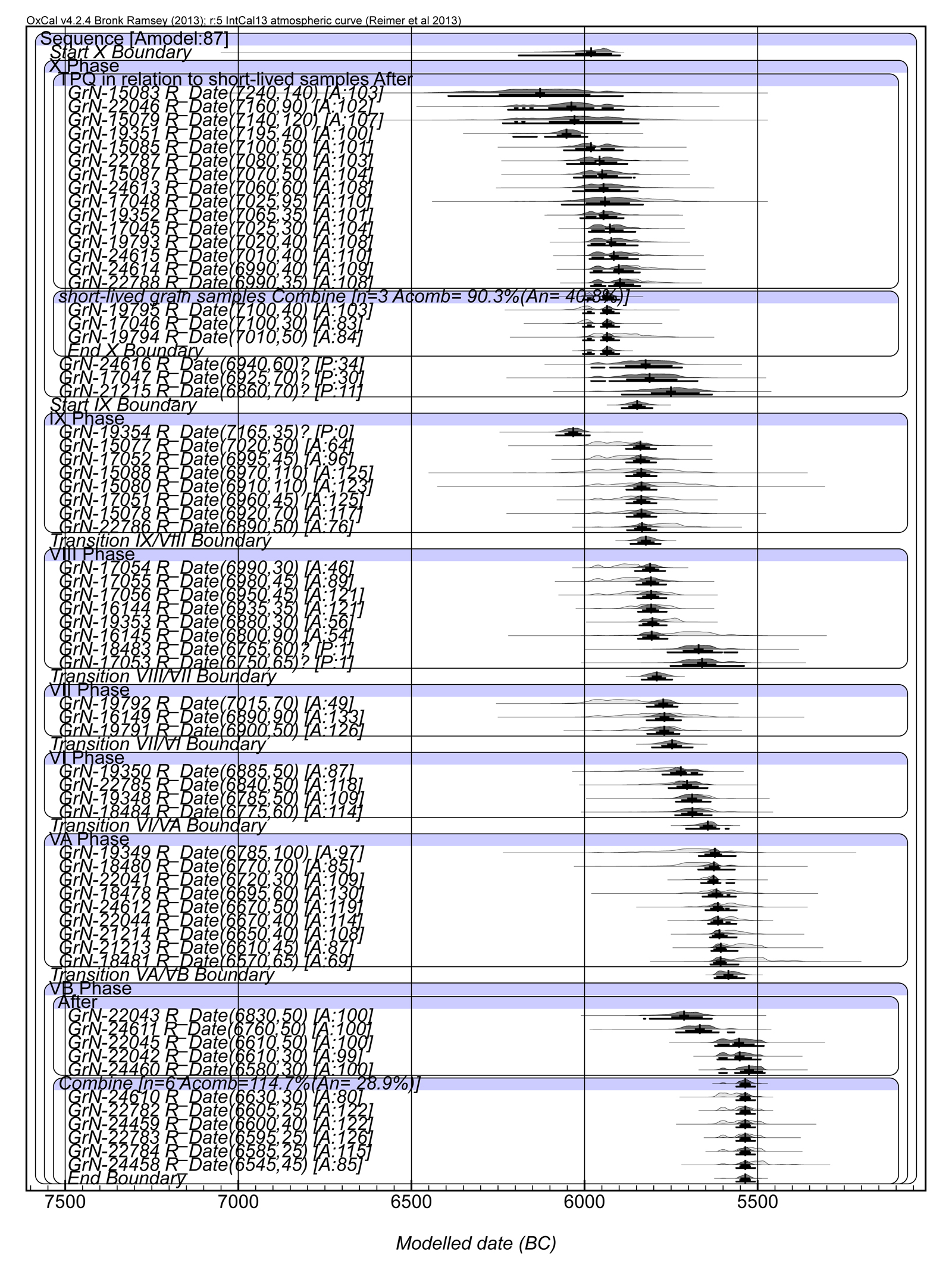 A sequential model, assuming the seven phases are contiguous, yields an unsatisfactory result (Amodel: 19), but a much better model (Amodel: 87) is gained when excluding some contextually doubtful dates contradicting the general sequence (GrN-24616, GrN-17047 and GrN-21215, all from Phase X, all too young, better at home in Phase VIII; GrN-19354 from Phase IX: too old, suggesting a Phase X intrusion; GrN-18483 and GrN-17053 from Phase VIII: too late, most likely Phase VI intrusions – compare Figure 3).